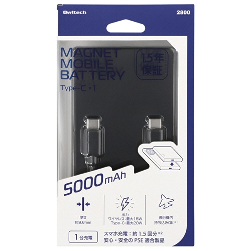 オウルテック ワイヤレスモバイルバッテリー 5000mAh ブラック OWL-LPBMG5002-BK 1個(ご注文単位1個)【直送品】