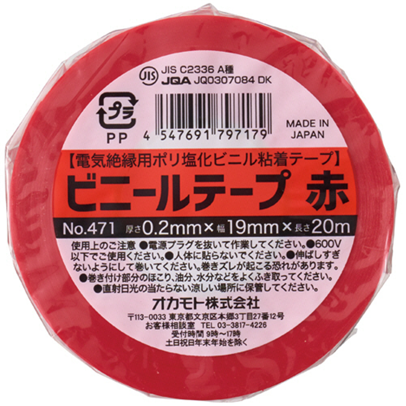 オカモト ビニールテープ No.471 19mm×20m 赤 1巻(ご注文単位1巻)【直送品】
