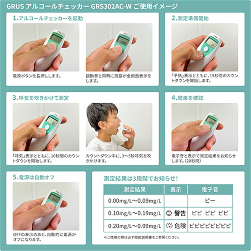 - 呼気1リットル中のアルコール濃度を測定●寸法/W3.5×D1.8×H9.5cm●重量/約20g●センサー/半導体式ガスセンサー●センサー寿命/約3000回●測定範囲/呼気0.00~0.99mg/L●吹込み時間/3~5秒程●電源/単4乾電池2本(別売)●機能/自動電源オフ、検出濃度別により3段階の液晶表示・3種類の電子音●材質/ABS樹脂●保証期間/1年●付属品/ストラップ※重量は電池含まず●道路交通法が定める呼気1リットル中アルコール濃度を表示します。●国土交通省は、飲酒運転ゼロを目指した取り組みの一つとして、運送事業者が運転者に対してアルコール検知器を使用した運転者の酒気帯びの有無を確認することを義務付けています。●ボタンを長押しすると、電源がオンになり測定準備を開始します。15秒間の測定準備の後、計測開始となります。呼気を計測部に3~5秒程度吹きかけます。アルコールを検知した場合、電子音と表示で測定結果をお知らせします。●液晶は日本語表示で、センサーは約3000回ご使用いただけます。