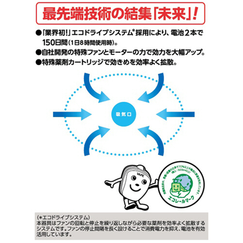 - 電池が先になくならない!電池・薬剤交換なしで150日間!●本体・付替/本体●効果/虫よけ●効果範囲/4.5~10畳●使用可能日数/150日●サイズ/W82×D58×H120mm●セット内容/本体器具1個、薬剤1個(電池付)●シリーズ名/ベープシリーズ※使用可能日数は1200時間/1日8時間使用として。●本体と薬剤のセットです。●電池式のためコンセントがいりません。●電池入り薬剤カートリッジでワンタッチ装着。●薬剤は取替OK。