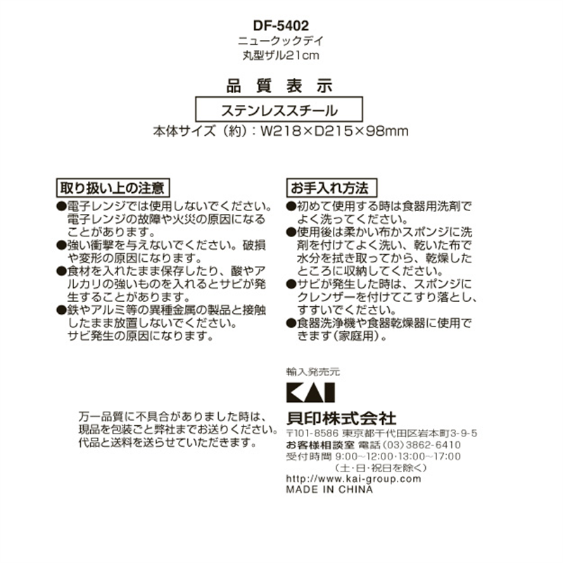 貝印 DF5402 丸型ザル 21cm 1個(ご注文単位25個)【直送品】