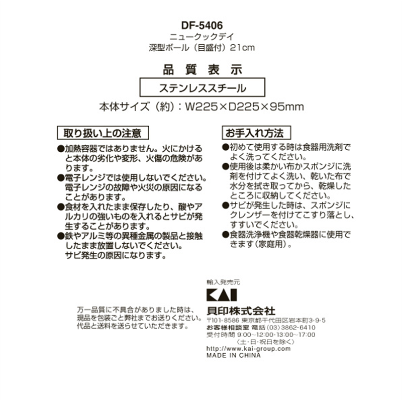 貝印 DF5406 深型ボール(目盛り付) 21cm 1個(ご注文単位10個)【直送品】