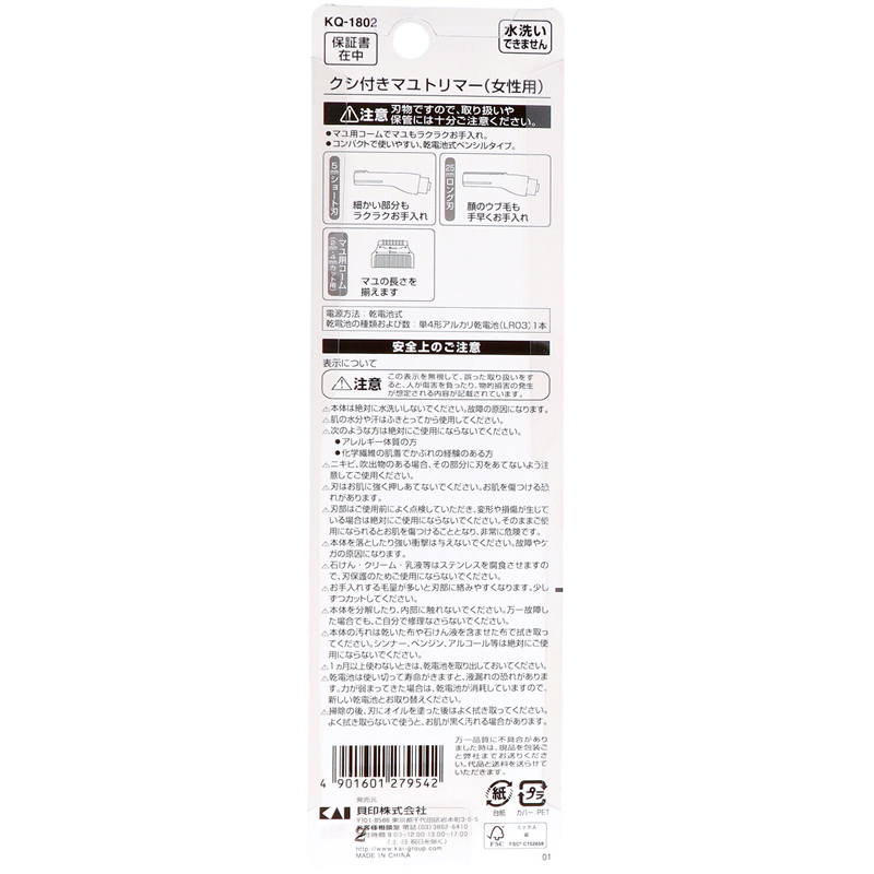 貝印 KQ1802 KQ クシ付きマユトリマー(女性用) 1個(ご注文単位12個)【直送品】