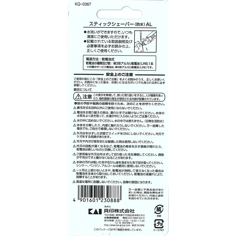 貝印 KQ0367 スティックシェーバー(防水)AL 1個(ご注文単位12個)【直送品】