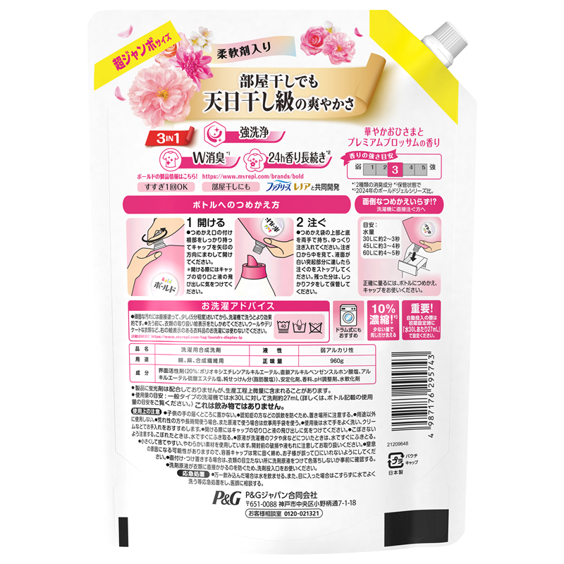 P&Gジャパン合同会社 ボールドジェル華やかプレミアムブロッサムの香りつめかえ用超ジャンボサイズ 960G 1パック(ご注文単位1パック)【直送品】
