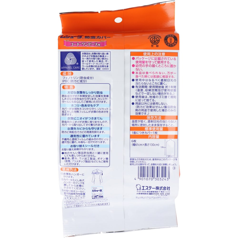 エステー ムシューダ防虫カバー 1年間有効 コート・ワンピース用 6枚入 1パック(ご注文単位1パック)【直送品】