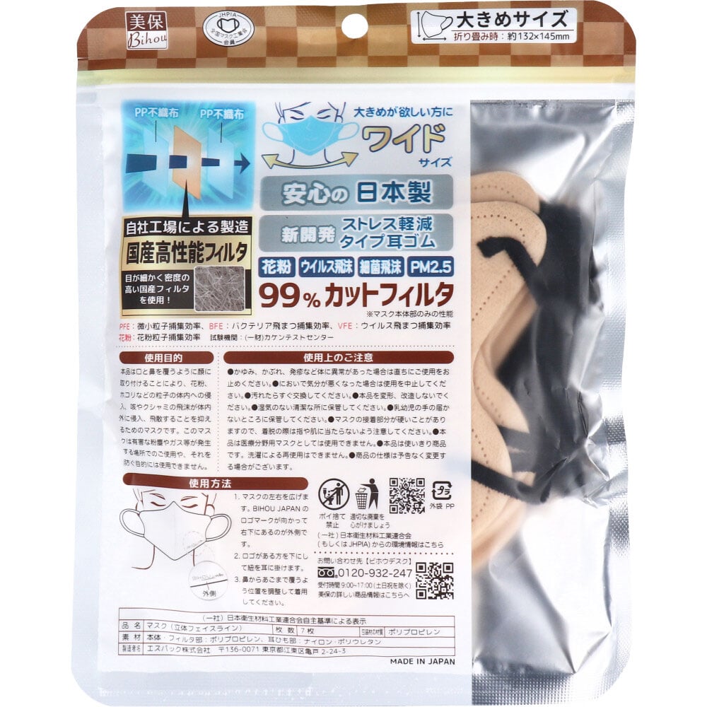 エスパック やさしいマスク 立体フェイスライン ワイドタイプ 大きめサイズ ベージュ×ブラック 7枚入 1袋(ご注文単位1袋)【直送品】