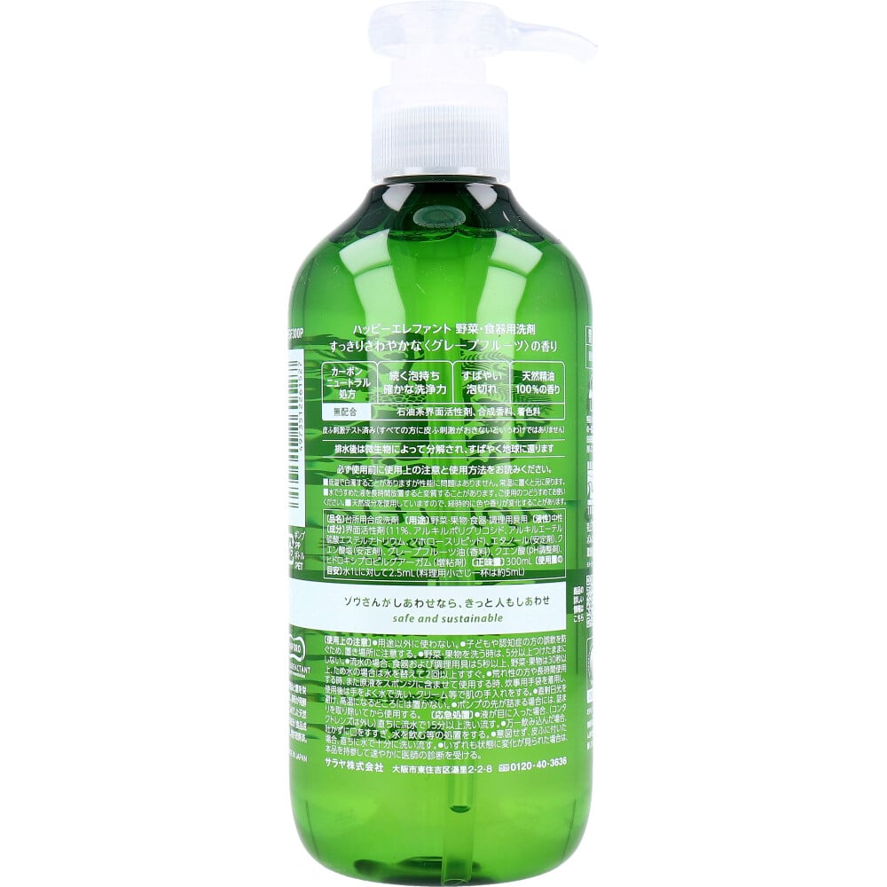 サラヤ ハッピーエレファント 野菜・食器用洗剤 グレープフルーツ 本体 300mL 1個(ご注文単位1個)【直送品】