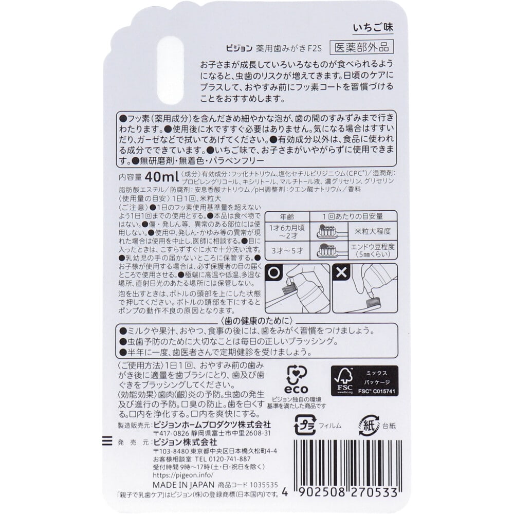 ピジョン 親子で乳歯ケア おやすみ前のフッ素コート 500ppm いちご味 40mL 1個(ご注文単位1個)【直送品】