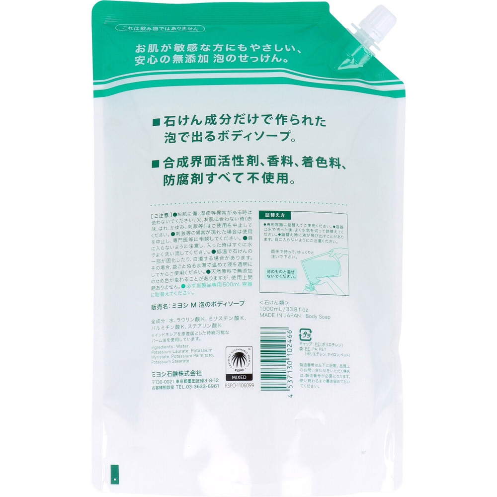 ミヨシ石鹸 無添加せっけん 泡のボディソープ スパウト 1.0L 1個(ご注文単位1個)【直送品】