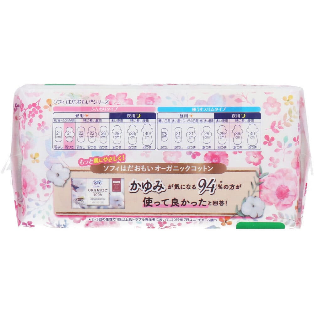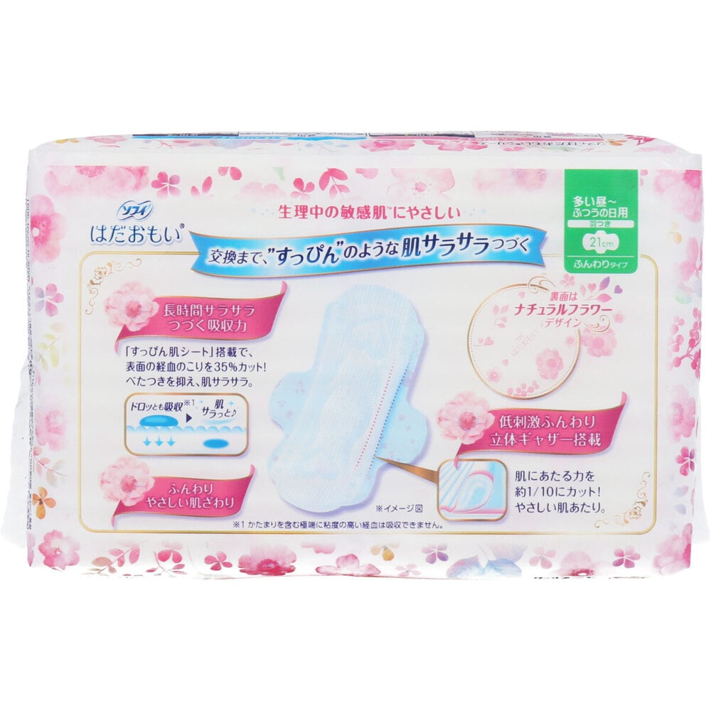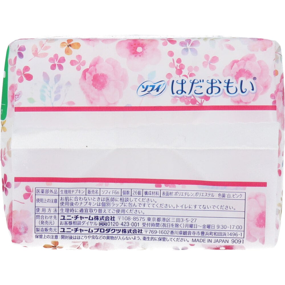 ●交換まで、「すっぴん」のような肌サラサラつづく。●長時間サラサラつづく吸収力。すっぴん肌シート搭載で、表面の経血のこりを35%カット!べたつきを抑え、肌サラサラ。※かたまりを含む極端に粘度の高い経血は吸収できません。●ふんわりやさしい肌ざわり。低刺激ふんわり立体ギャザー搭載。肌にあたる力を約1/10にカット(ユニ・チャーム社従来品比)!やさしい肌あたり。●裏面は、ナチュラルフラワーデザイン。憂うつな生理の日も、ちょっとHappyに。 ●【医薬部外品】 生理用ナプキン 販売名:ソフィF6n 【仕様】 用途:多い昼~ふつうの日用 羽:あり タイプ:ふんわりタイプ サイズ:21cm 【構成材料】 表面材:ポリエステル、ポリエチレン 色調:ピンク、白 【使用方法】 ・生理時に適宜取り替えてご使用ください。 【個装サイズ】 175X110X90mm 【個装重量】 約166g 【内容量】 26個入 【製造国】:日本 ●【使用上の注意】・お肌に合わないときは医師に相談してください。・使用後のナプキンは個別ラップに包んで専用箱に捨ててください。・トイレに流さないでください。★保管上の注意・開封後はほこりや虫などの異物が入らないよう、衛生的に保管してください。
