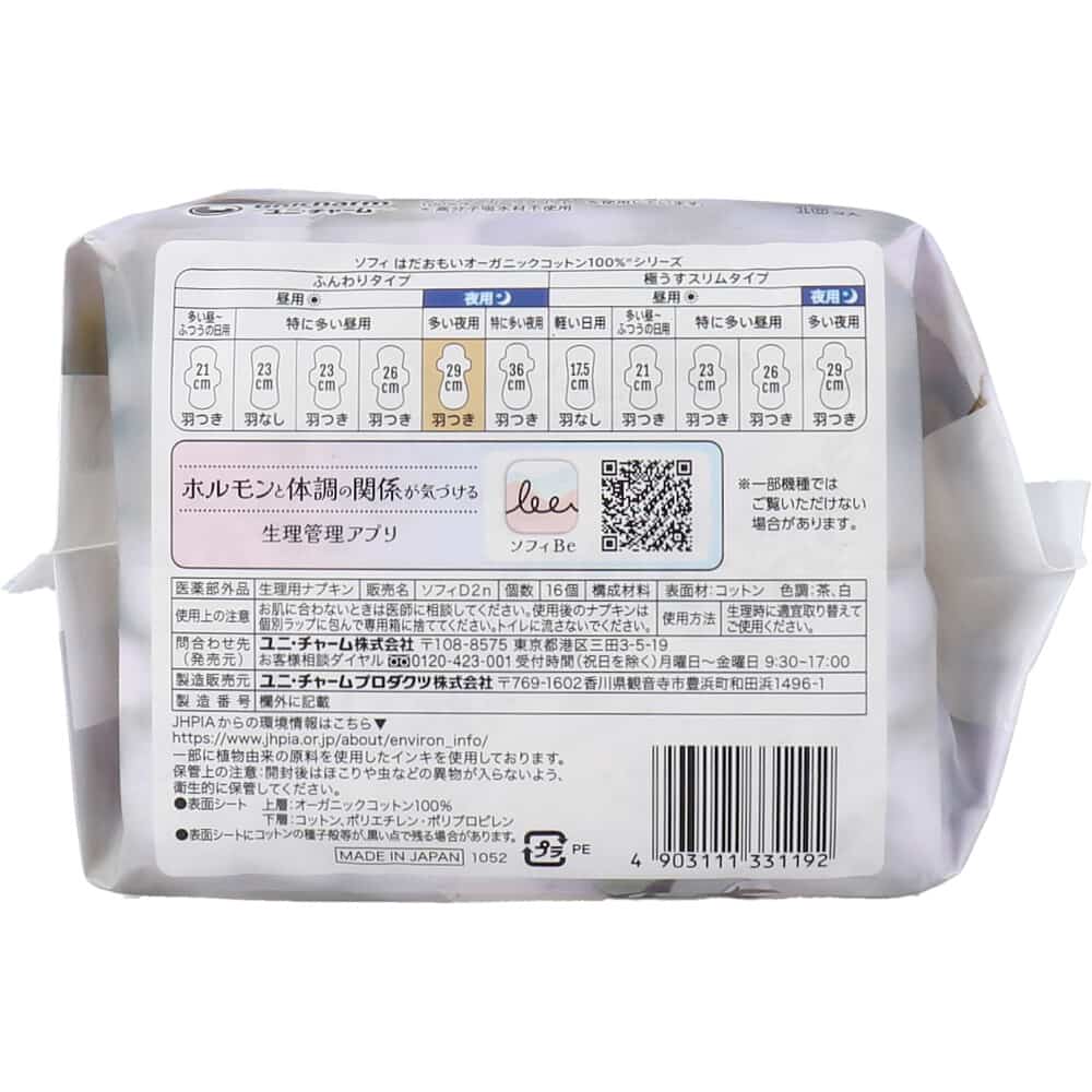 ユニ・チャーム ソフィ はだおもい オーガニックコットン100% 多い夜用 羽つき 29cm 16コ入 1パック(ご注文単位1パック)【直送品】