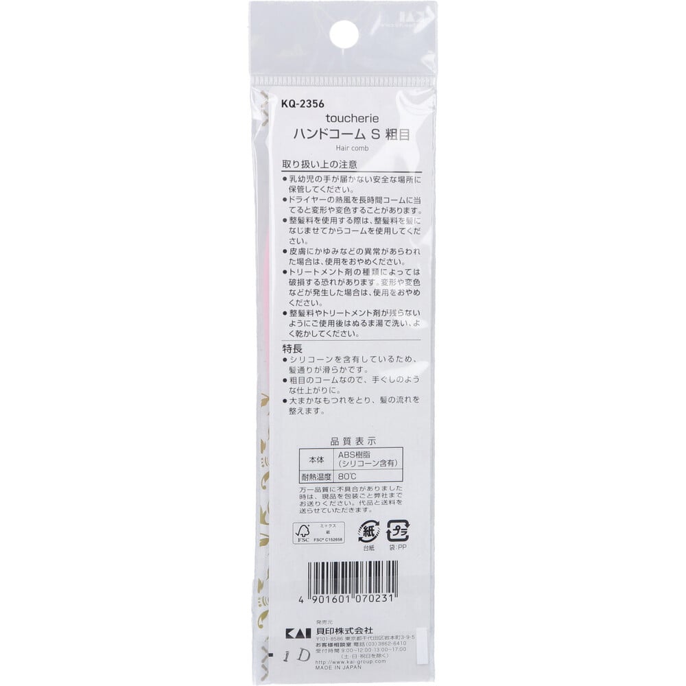 貝印 toucherie ハンドコームS 粗目 KQ-2356 1個(ご注文単位1個)【直送品】