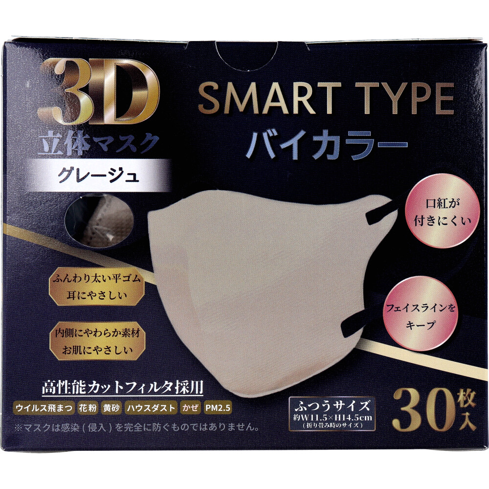 iiもの本舗 3D立体マスク スマートタイプ バイカラー グレージュ ふつうサイズ 30枚入 1箱(ご注文単位1箱)【直送品】