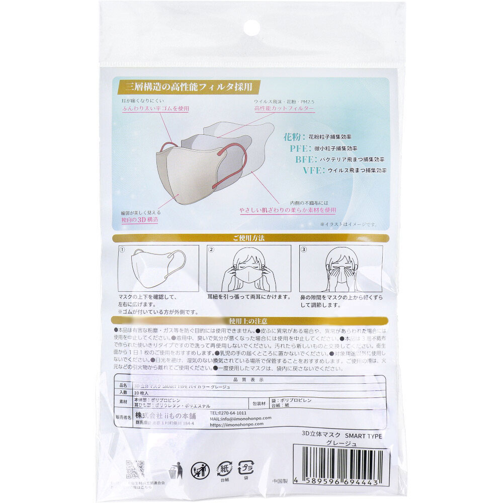 iiもの本舗 3D立体マスク スマートタイプ バイカラー グレージュ ふつうサイズ 10枚入 1袋(ご注文単位1袋)【直送品】