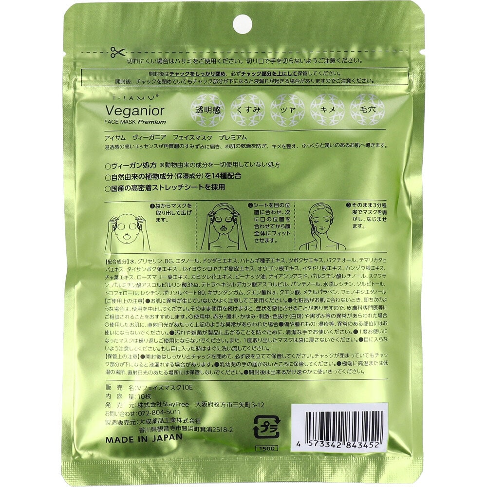 StayFree アイサム ヴィーガニア ドクダミ&ハトムギ フェイスマスク プレミアム 10枚入 1パック(ご注文単位1パック)【直送品】