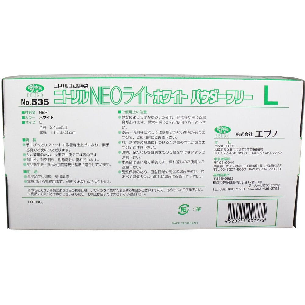 エブノ 【業務用】ニトリル手袋 NEOライト パウダーフリー ホワイト Lサイズ 100枚入 1箱(ご注文単位1箱)【直送品】