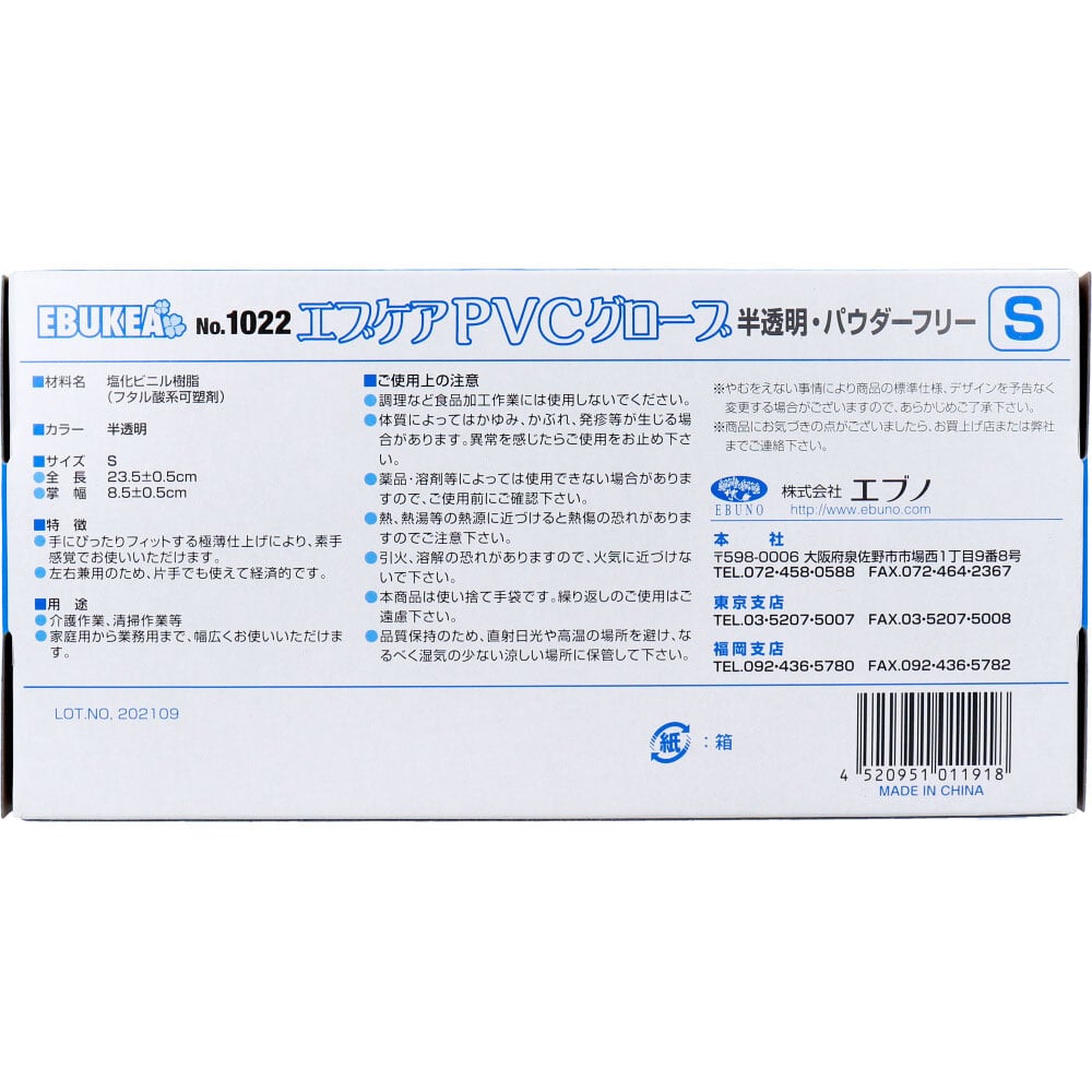 エブノ 【業務用】No.1022 エブケアPVCグローブ 半透明 パウダーフリー 使い捨て手袋 Sサイズ 100枚入 1箱(ご注文単位1箱)【直送品】