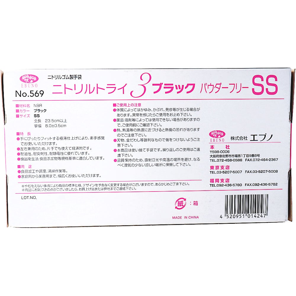 エブノ 【業務用】No.569 ニトリルトライ3 ブラック パウダーフリー ニトリルゴム製 使い捨て手袋 SSサイズ 100枚入 1箱(ご注文単位1箱)【直送品】