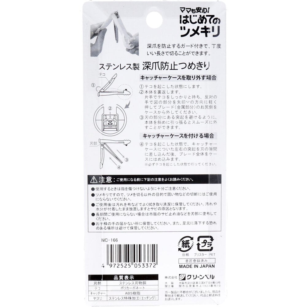 グリーンベル はじめてのツメキリ ステンレス製 深爪防止ツメキリ NC-166 1個(ご注文単位1個)【直送品】