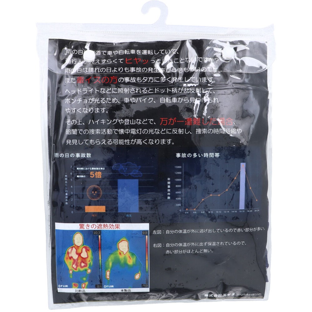 ●ドットが光る。早期発見、早期救出。●全身が反射し、懐中電灯などで早期発見が可能。●車のライトに反射し、夜間の事故を防止。●遮熱効果が高く、体温の保温が可能。●耐水度24000mm、完全防水効果。 ●【素材】 ポリエステル100% ※表:撥水加工、裏:ポリウレタンコーティング防水 【耐水性】 24000mm以上 【サイズ】 フリー 【寸法】 幅:約110cm 長さ:前約106cm、後ろ約86.5cm 【個装サイズ】 250X330X15mm 【個装重量】 約315g 【内容量】 1着入 【製造国】:中国 ●【使用上の注意】・ご使用後は直射日光や、高温多湿の場所を避け、自然乾燥させてください。・お手入れの際は水で手洗いしていただき、洗濯機等のご使用はお避けください。機械の転倒や破損の可能性があり、大変危険です。・生地を強く揉んだり、絞ったりされますと生地表面のコーティングが剥離する恐れがあります。・ドライクリーニングはおやめください。・タンブラー乾燥は絶対にしないでください。