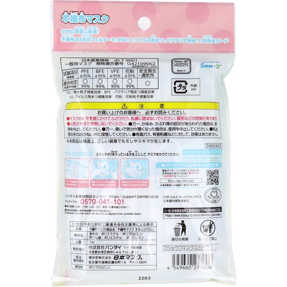 バンダイ こども不織布マスク すみっコぐらし 7枚入 1袋(ご注文単位1袋)【直送品】
