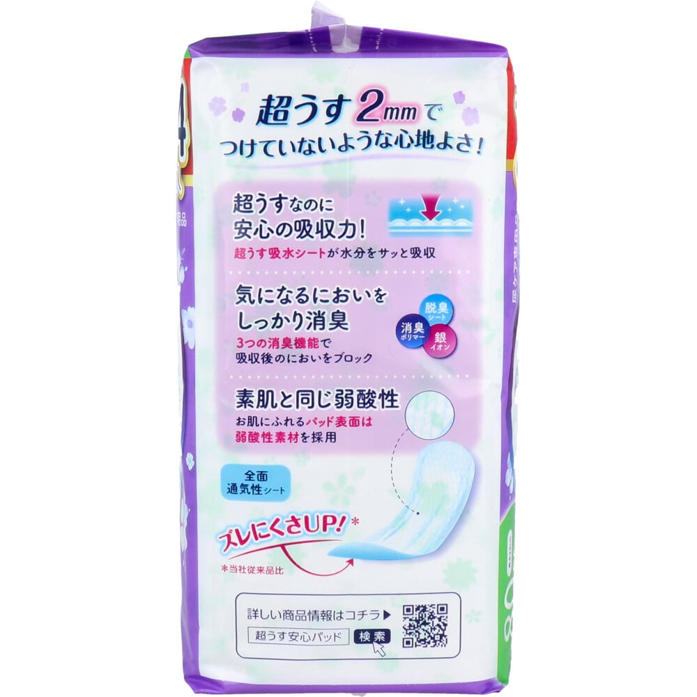 ●超うすなのに、安心の吸収力。超うす吸収体で、驚きのうすさと高い吸収性能を両立。圧倒的なつけ心地の良さを実感していただけます。●お肌へのやさしさにも配慮。弱酸性素材を採用し、さらっとしたつけ心地になりました。●気になるにおいをしっかり消臭。3方向から気になる「におい」に対処するので、人と会うときも安心です。●コンパクトで携帯に便利。超うす型のパッドなので、ポーチにもすっきり収まります。●花柄の個包装デザイン。携帯時や使用時の抵抗感を和らげる女性らしいデザイン。 ●【医療費控除対象品】 大人用紙おむつ(軽度失禁用) 【製品サイズ】 巾9.5cm×長さ23cm/薄さ2mm 吸収量目安・・・80cc 【素材】 表面材・・・ポリエチレン/ポリエステル不織布 吸水材・・・高分子吸水材/吸水紙 防水材・・・ポリエチレンフィルム 止着材、結合材・・・スチレン系エラストマーなど 【個装サイズ】 176X104X90mm 【個装重量】 約260g 【内容量】 34枚入 【製造国】:日本 ●【使用上の注意】・汚れたパッドは早くとりかえてください。・テープは直接お肌につけないでください。・誤って口に入れたり、のどにつまらせることのないよう保管場所に注意し、使用後はすぐに処理してください。・パッドがお肌に合わない場合には、ご使用を中止し、医師にご相談ください。・生理用ナプキンではありません。・経血の吸収には不向きです。【使用後の注意】・汚れた部分を内側にして丸めて、不衛生にならないように処理してください。・トイレにパッドを流さないでください。・使用後のパッドの廃棄方法は、お住まいの地域のルールに従ってください。・外出時に使ったパッドは持ち帰りましょう。【保管上の注意】・開封後は、ほこりや虫が入らないよう、衛生的に保管してください。