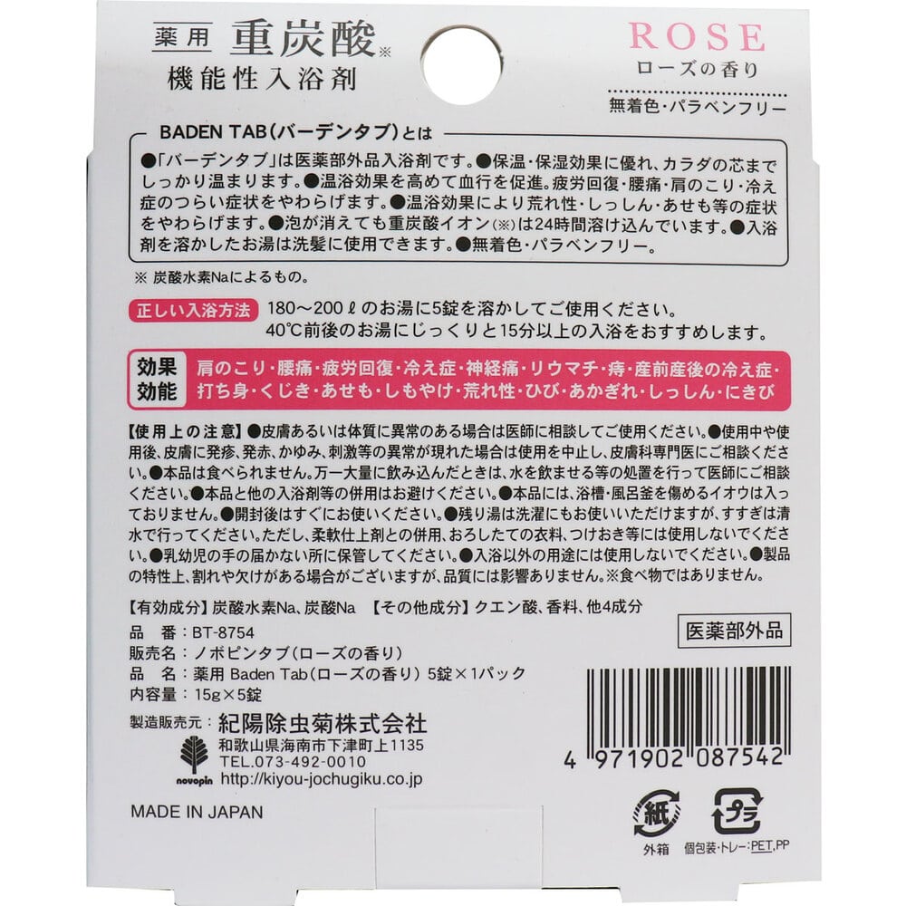 紀陽除虫菊 薬用 重炭酸 機能性入浴剤 バーデンタブ ローズの香り 5錠 1パック(ご注文単位1パック)【直送品】