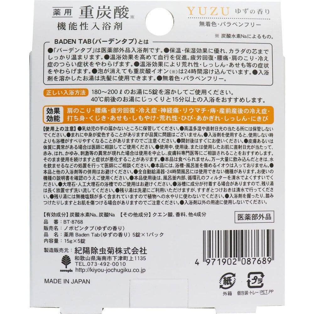 紀陽除虫菊 薬用 重炭酸 機能性入浴剤 バーデンタブ ゆずの香り 5錠 1パック(ご注文単位1パック)【直送品】