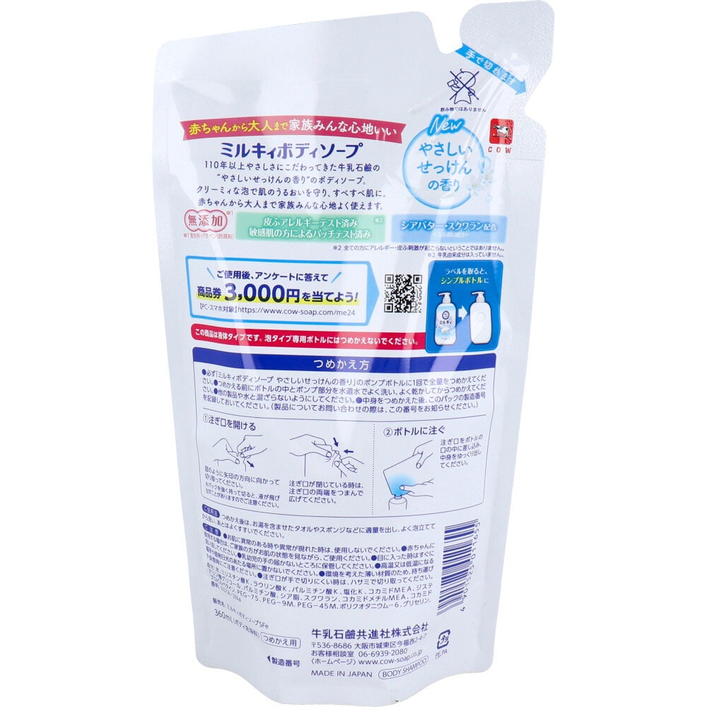●110年以上やさしさにこだわってきた牛乳石鹸の「やさしいせっけんの香り」のボディソープ。●クリーミィな泡でうるおいを守り、すべすべ肌に。●赤ちゃんから大人まで家族みんなで心地よく使えます。●無添加(着色料、パラベン(防腐剤))●皮ふアレルギーテスト済み・敏感肌の方によるパッチテスト済み。※全ての方にアレルギー・皮ふ刺激が起こらないということではありません。●シアバター・スクワラン配合(うるおい成分)●ラベルを取ると、シンプルボトルに。 ●【化粧品】 ボディ洗浄料 販売名:ミルキィボディソープSFe 【成分】 水、ミリスチン酸K、ラウリン酸K、パルミチン酸K、塩化K、コカミドMEA、ジステアリン酸グリコール、パルミチン酸、シア脂、スクワラン、コカミドメチルMEA、コカミドプロピルベタイン、PPG-75、PPG-9M、PPG-45M、ポリオクタニウム-6、グリセリン、香料、EDTA-2Na 【つめかえ方】 ・必ず「ミルキィボディソープやさしいせっけんの香り」のポンプボトルに1回で全量をつめかえてください。 ・つめかえる前にはボトルの中とポンプ部分を水道水でよく洗い、よく乾かしてからつめかえてください。 ・他の製品や水と混ざらないようにしてください。 ・中身をつめかえた後、パックの製造番号を記録しておいてください。 (1)注ぎ口を開ける:パッケージの矢印の方向に向かって切り取ってください。 注ぎ口が閉じているときは、注ぎ口の両端をつまんで広げてください。 (2)ボトルに注ぐ:注ぎ口をボトルの口の中に差し込み、中身をゆっくり出してください。 【ご使用方法】 ※この商品は液体タイプです。泡タイプの製品をつめかえないでください。 ・つめかえ後は、お湯を含ませたタオルやスポンジなどに適量を出し、よく泡立ててから洗い、あとはよくすすいでください。 【個装サイズ】 130X230X60mm 【個装重量】 約377g 【内容量】 350mL 【製造国】:日本 ●【ご注意】・お肌に異常のある時や異常が現れた時は、使用しないでください。・赤ちゃんに使用する場合は、ご家族の方がお肌の状態を見ながら、ご使用ください。・目に入った時はすぐに洗い流してください。・乳幼児の手の届かないところに保管してください。・高温又は低温になる場所や直射日光のあたる場所に置かないでください。・環境を考えた薄い材質のため、持ち運びや保管場所にご注意ください。・注ぎ口が手で切りにくい時は、ハサミで切り取ってください。