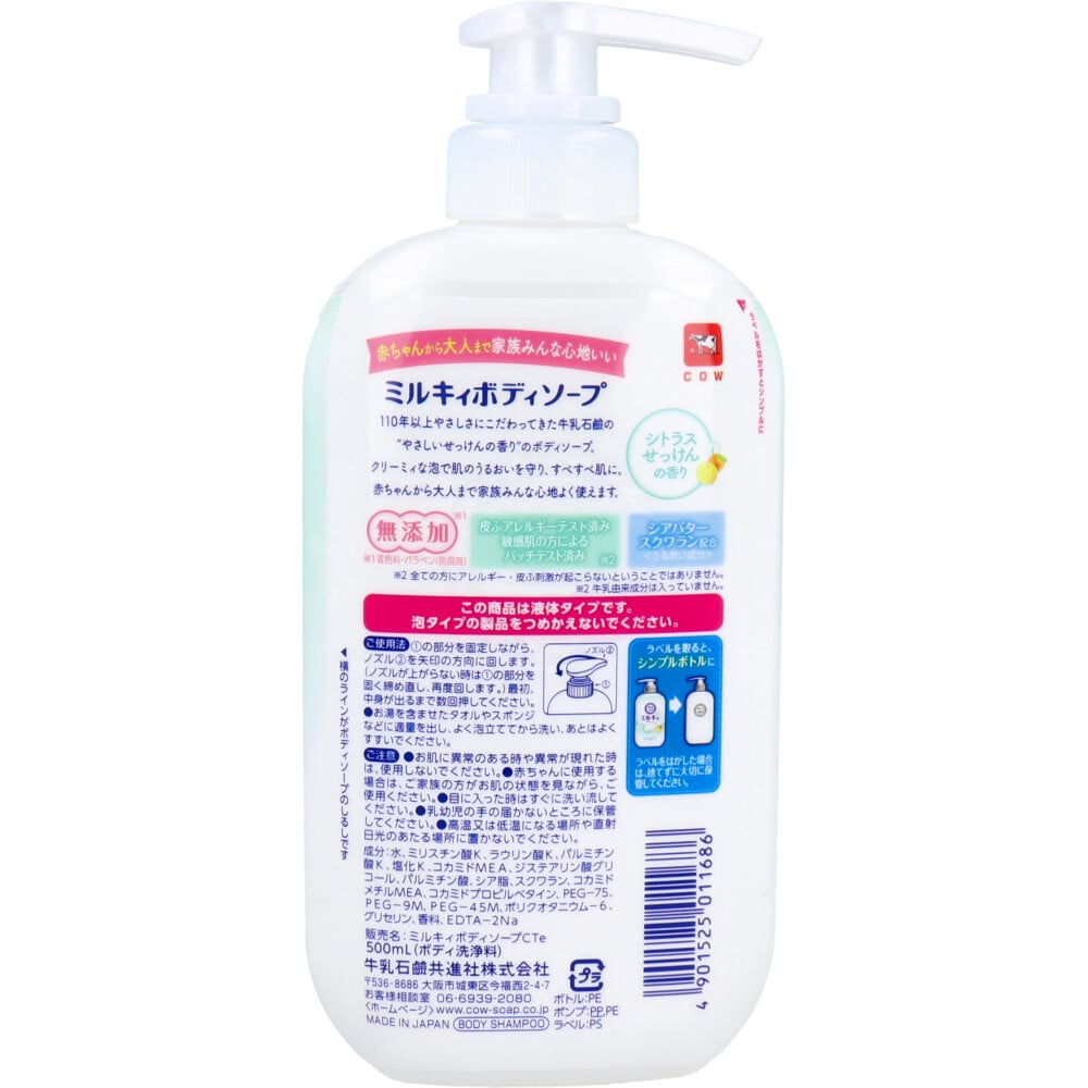 牛乳石鹸共進社 ミルキィ ボディソープ シトラスせっけんの香り ポンプ付 500mL 1個(ご注文単位1個)【直送品】