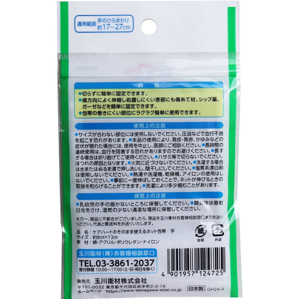 玉川衛材 ケアハート そのまま使えるネット包帯 手 1枚入 1パック(ご注文単位1パック)【直送品】