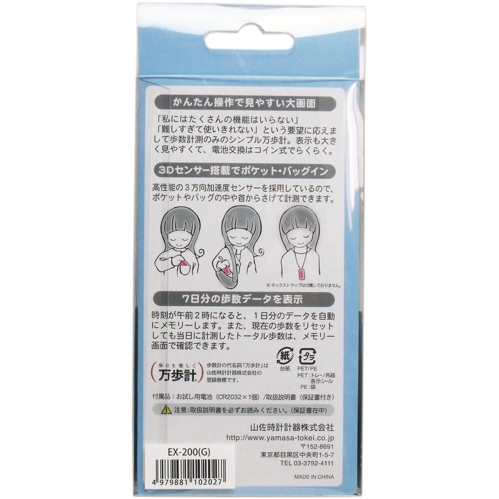 ●見やすく、使いやすく、持ちやすく!●20gの軽量・コンパクトボディで、見やすい大型1段 表示。●葉の柄のエコグリーン。●7日分の歩数データをメモリー。●コイン式開閉フタだから、らくらく電池交換。●3方向加速度センサー採用。 ●【仕様】 型番・・・EX-200 カ ラ ー・・・スノーホワイト(W)・サクラピンク(P)・エコグリーン(G) 外形寸法・・・60×33×11mm(幅/高/厚) 質量・・・約20g(電池を含む) 使用電池・・・CR2032電池1個 電池寿命・・・約10ヶ月(1日1万歩または1日4時間使用にて) 【個装サイズ】 78X165X30mm 【個装重量】 62g ●【注意】・取扱説明書を必ずお読みください。