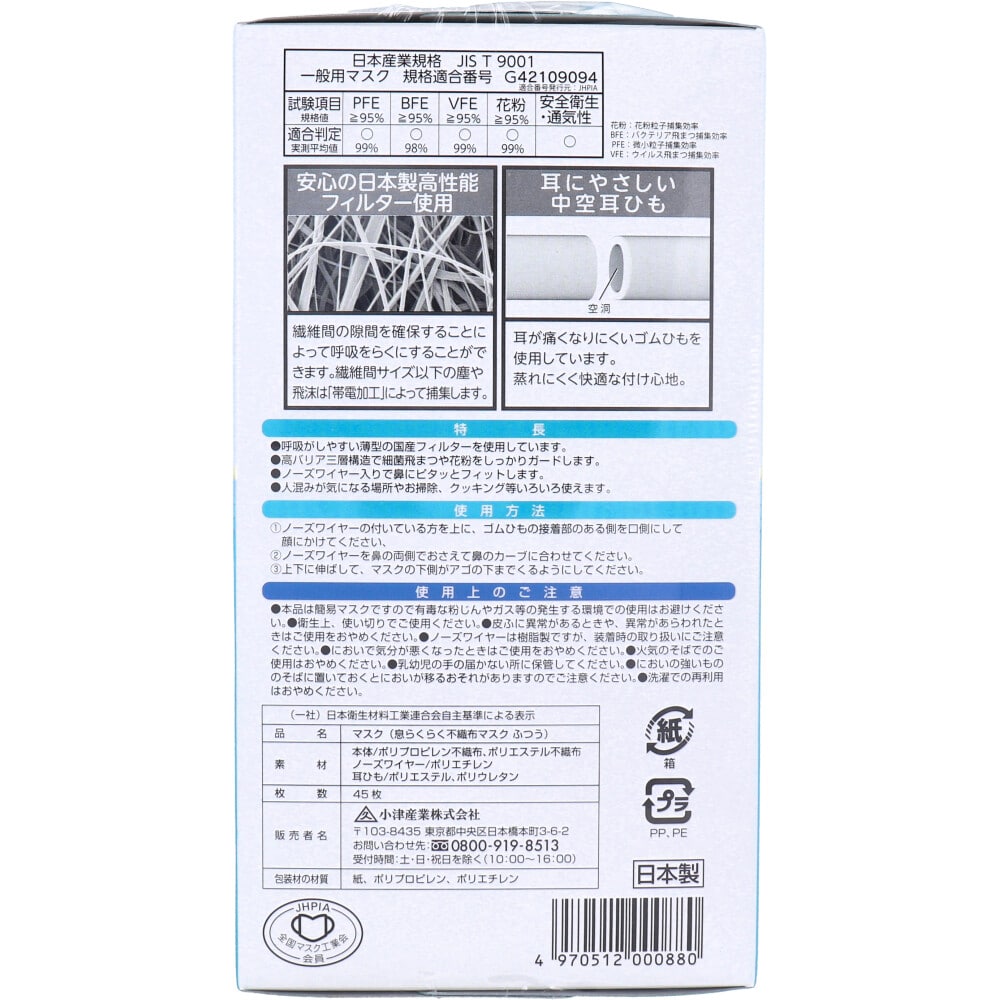 小津産業 デュウエアー 息らくらく不織布マスク ふつうサイズ 45枚入 1箱(ご注文単位1箱)【直送品】