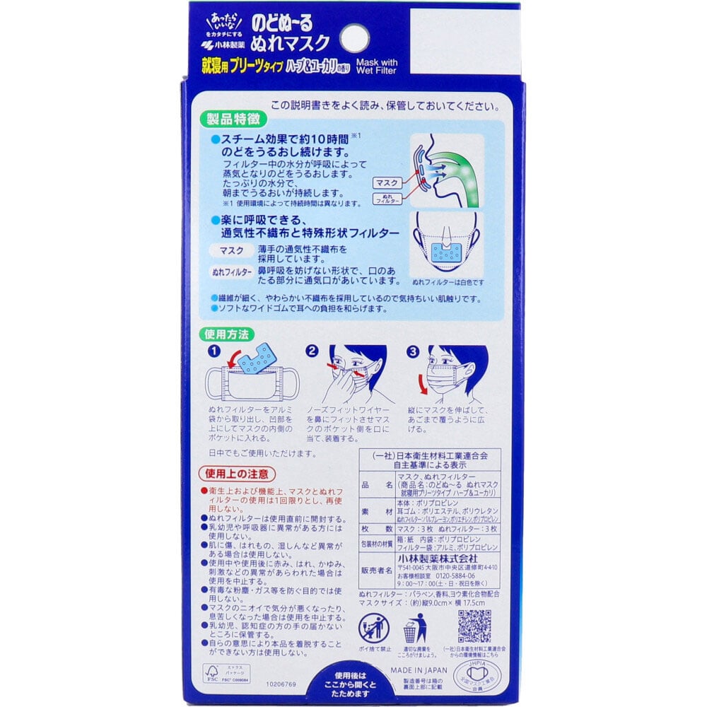小林製薬 のどぬーる ぬれマスク 就寝用 プリーツタイプ ハーブ&ユーカリの香り 3セット入 1袋(ご注文単位1袋)【直送品】