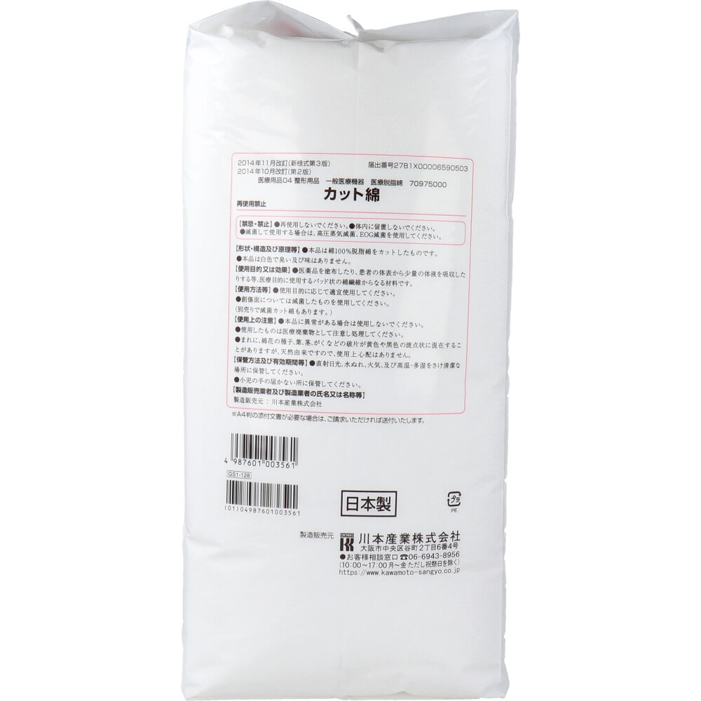 川本産業 カワモト 医療脱脂綿 カット綿(カットメン) 8cm×16cm 500g 1個(ご注文単位1個)【直送品】