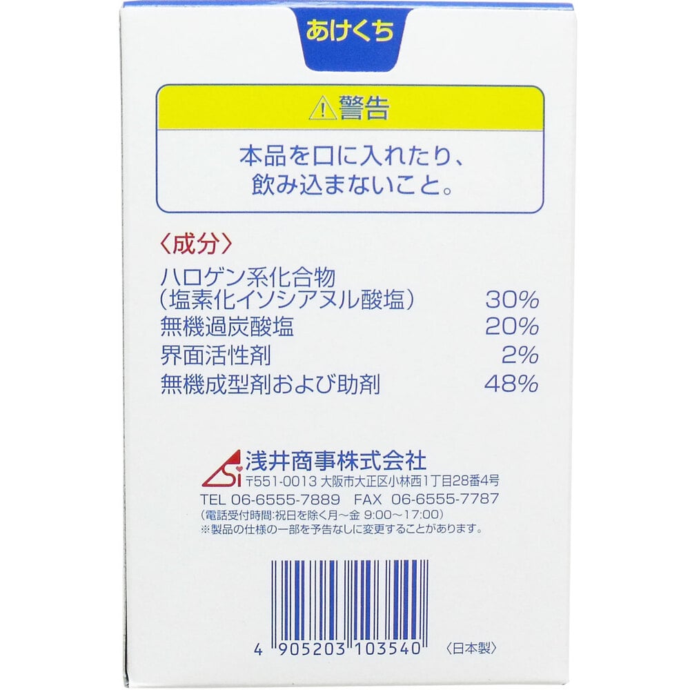 ●ハロゲン系化合物の働きにより、便臭・尿臭などの臭いを消臭します。除菌効果が高く、ポータブルトイレや尿器に最適です。●防汚、洗浄、漂白効果で、排泄物の汚れが付きにくく、また落ちやすくなります。●発砲タイプですので、すぐに溶けて効果を発揮します。●効果は1日持続します。1日に1錠ご使用ください。●水に溶けると無色透明ですので、便や尿の状態がよく分かります。●使用後は浄化槽式トイレに流すことができます。●使用目安は約3ヶ月分です。●お徳用100錠入です。 ●【成分】 ハロゲン系化合物(塩素化イソシアヌル酸塩)・・・30% 無機過炭酸塩・・・20% 界面活性剤・・・2% 無機成型剤及び助剤・・・48% 【使い方】 <ポータブルトイレの場合> ・水を1~2L入れてから1錠を入れてください。 <尿器の場合> ・使用前に1錠を入れてください。尿に溶けて効果を発揮します。 【個装サイズ】 70X109X70mm 【個装重量】 約270g 【内容量】 2g×100錠入 【製造国】:日本 ●【注意】<警告>・本製品を口に入れたり、飲み込まないこと。・本製品は塩素系です。酸性タイプの洗浄剤などとまぜないでください。まぜると塩素ガスなどが発生し、危険な場合があります。<保管及び使用上の注意>・皮膚や衣類に付着した場合はすぐに石けん水で洗い流してください。・使用後はお子様やお年寄りの手の届かない場所に保管し、薬と間違えて飲み込まないように十分ご注意ください。・万が一飲み込んだ場合は大量の水を飲ませ、吐かせるなどの処置をしてから、また目に入った場合は流水で十分洗い流した後、医師の手当てを受けてください。・誤用を避け品質を保持するために、他の容器に入れ替えないでください。・直射日光を避け、涼しい場所で、ふたをしっかり閉めて保管してください。