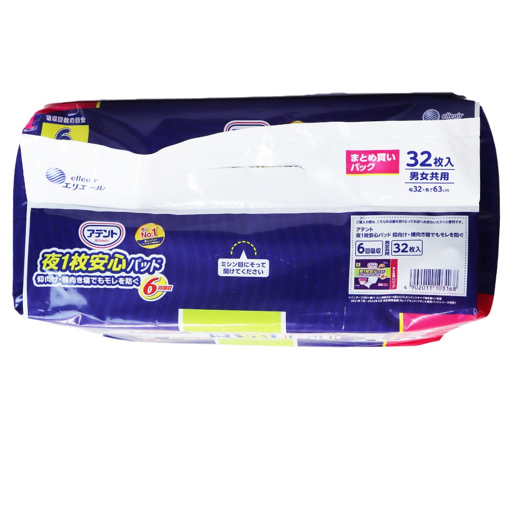 大王製紙 アテント 夜1枚安心パッド モレを防いで朝までぐっすり 6回吸収 32枚入 1パック(ご注文単位1パック)【直送品】