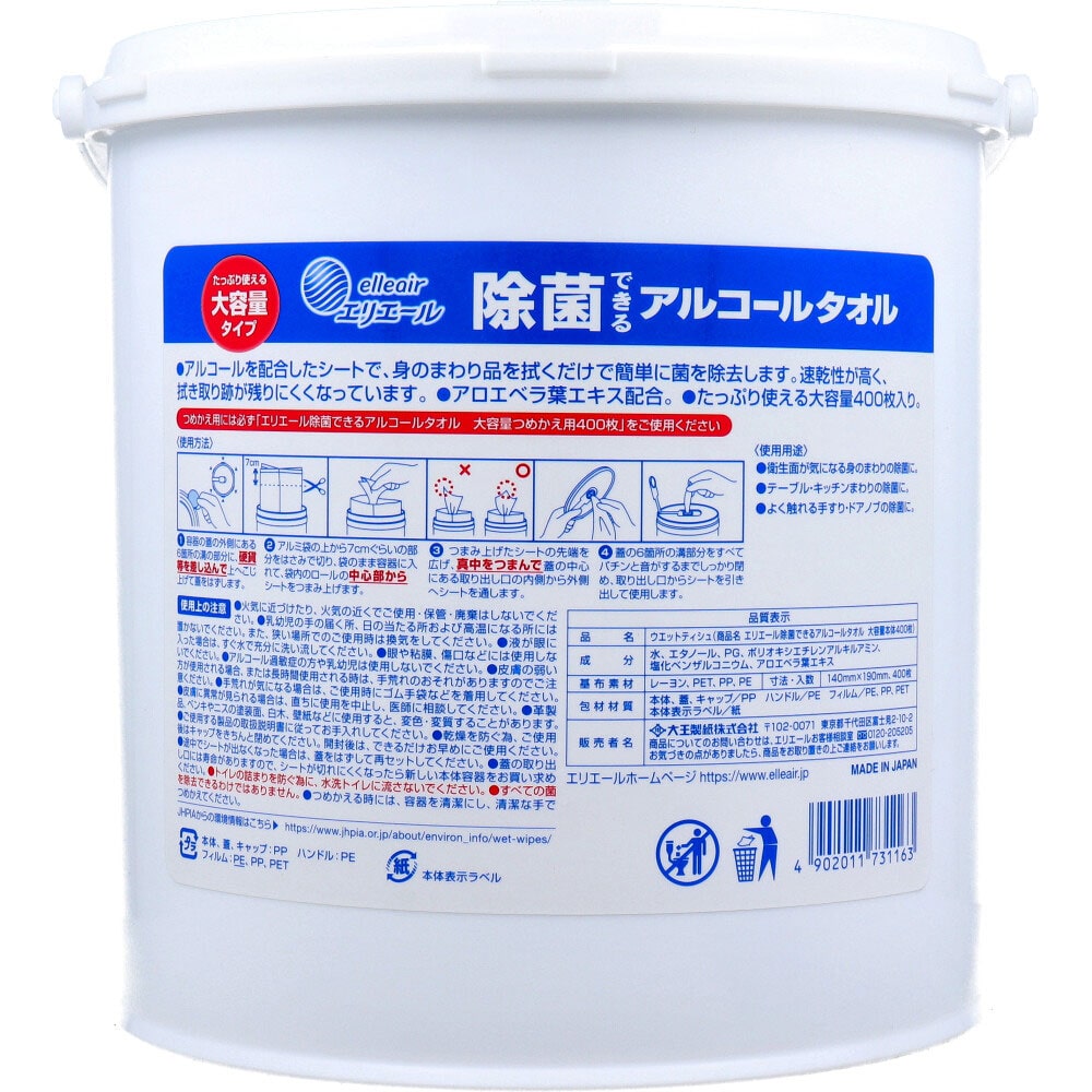 大王製紙 エリエール 除菌できるアルコールタオル 大容量 本体 400枚入 1パック(ご注文単位1パック)【直送品】