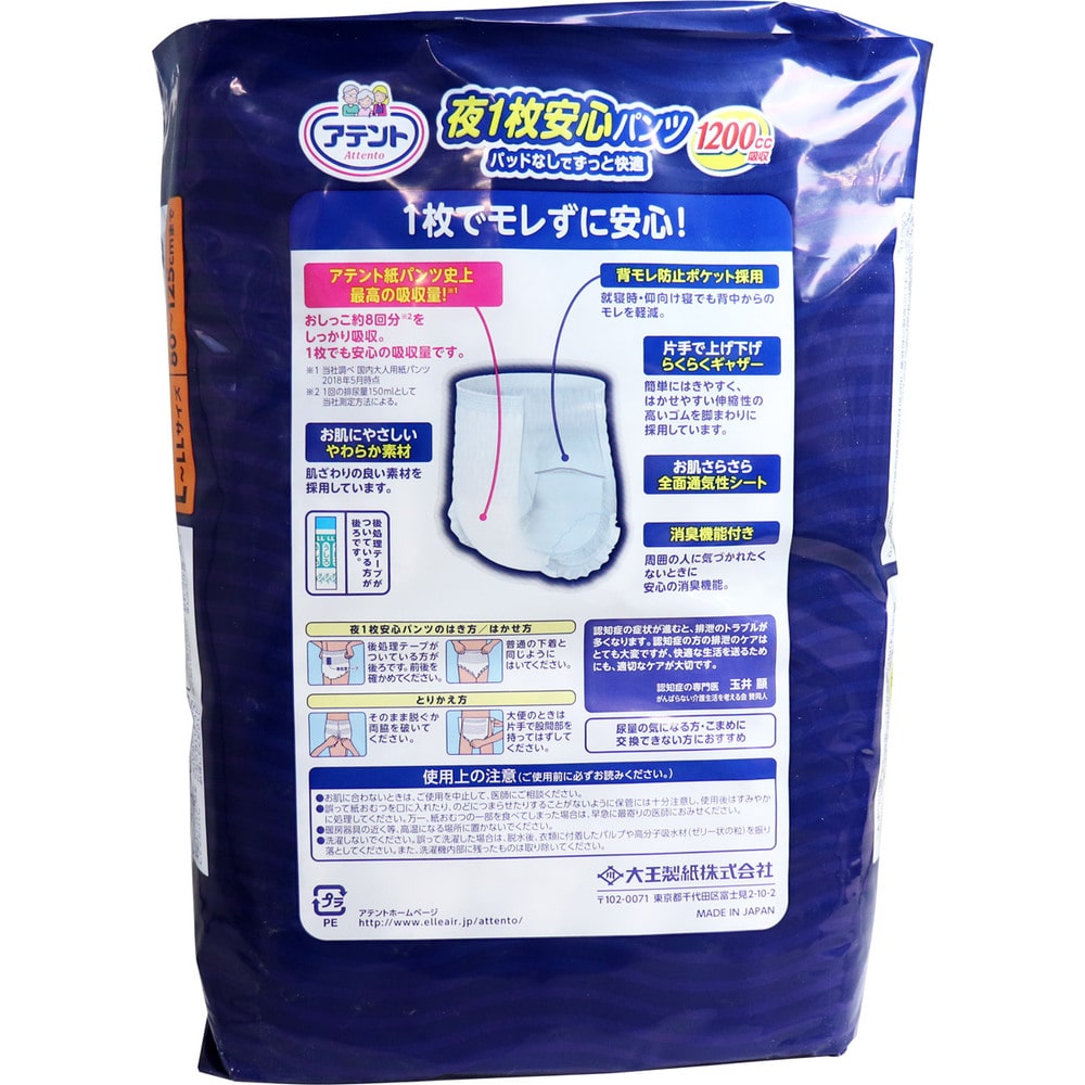 大王製紙 アテント 夜1枚安心パンツ パッドなしでずっと快適 男女共用 L-LLサイズ 12枚入 1パック(ご注文単位1パック)【直送品】