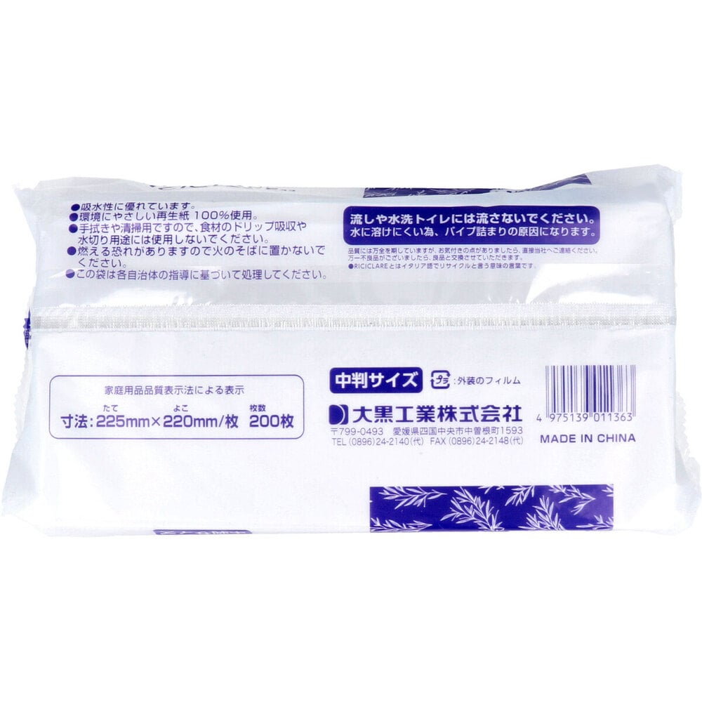大黒工業 RICICLARE(リチクラーレ)32 ペーパータオル 中判サイズ シングル 200枚入 1パック(ご注文単位1パック)【直送品】