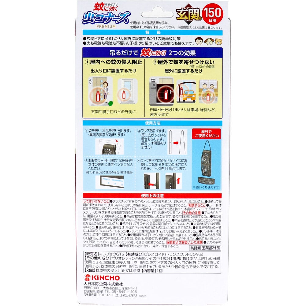 ●吊るだけで、屋内への侵入阻止+屋外で寄せつけない効果!簡単蚊対策!●玄関ドアに吊るしたり、屋外に設置するだけの簡単蚊対策!●火も電気も電池も不要。お子様、犬、猫のいるご家庭でも使えます。●屋内への蚊の侵入阻止 。出入口に設置するだけ。玄関や勝手口などの外側に。●屋外で蚊を寄せつけない。屋外に設置するだけ。門扉・郵便受けまわり、駐輪場、縁側など、屋外空間で。●立体構造で表面積を拡大!ワイドに薬剤が広がる!●メッシュの中に薬剤が練り込み。薬剤が徐々に拡散し、最後までしっかり広がる。雨でも流れ落ちにくい! ●無臭●季節を問わず蚊の出る時期に約150日間ずっと効く!●フックの長さを調節し、いろいろな玄関にご使用できます。※風やドアの開閉で、本品が落下する可能性がある場合は、ひもや輪ゴム等で固定してください。※特殊なドアには、設置できない場合があります。 ●【防除用医薬部外品】 販売名:キンチョウGT6 【成分】 ★有効成分 ・ピレスロイド(トランスフルトリン9%) ★その他の成分 ・ポリオレフィン系樹脂、その他1成分 【用法用量】 本品は150日間使用できる。 蚊成虫の侵入防止を目的に、窓やドア等の出入り口の屋外に1個設置して使用する。 蚊成虫の忌避を目的に、半径1m(3平方メートル)あたり1個の割合で屋外で使用する。 【効能】 蚊成虫の侵入阻止又は忌避 【使用方法】 (1)袋を破り、本品を取り出します。(薬剤の揮散が始まります) (2)お取替え日(使用開始150日後)を本体の裏面に油性ペンでご記入ください。 (3)フックを広げます。(既に広がっている場合もあります。品質には問題ありません。) (4)フックをドアに吊るせるサイズに調整し、突起部分を本品の横穴に入れた後、上へ引き上げ固定します。 ※屋外でご使用ください。 ※置いても使えます。 【個装サイズ】 115X229X42mm 【個装重量】 約100g 【内容量】 1個 ●【使用上の注意】・プラスチック容器の中のメッシュに直接触れたり、取り出したりしないこと。・連続して薬剤が揮散するので、使用しないときは元の袋に戻し、テープ等で必ず密封すること。・万一、身体に異常を感じた場合や、メッシュを誤って口にした場合は、できるだけ本品を持って、本品がピレスロイド系のトランスフルトリンを含有する殺虫剤であることを医師に告げて、診療を受けること。・定められた用法・用量をよく守り使用すること。・本品は蚊成虫を対象とした製品です。蚊の発生時期に使用すること。・風の影響を受ける場合、十分な効果が得られない恐れがあるので注意すること。・本品を直射日光が当たるところや高温になるところに置かないこと。・使用中はプラスチック容器の開口部をふさがないこと。・火気の付近では使用しないこと。・使用中及び使用後は、小児やペットが触れることのないように注意すること。・観賞魚等のいる水槽に、本品が入らないようにすること。・メッシュに触れた場合は、石けんを用い水でよく洗うこと。・アレルギー体質の方は、ご使用の際に注意すること。・使用期間が終了したら、新しい薬剤に交換すること。・強風時など本品が激しく揺れると、設置場所の素材によっては傷つける恐れがあるので、その際は一旦本品を外すこと。・捨てるときは、メッシュを取り出さずに、自治体の指示に従って適切に廃棄すること。・小児の手の届かない所に保管すること。・直射日光を避け、涼しい場所に保管すること。