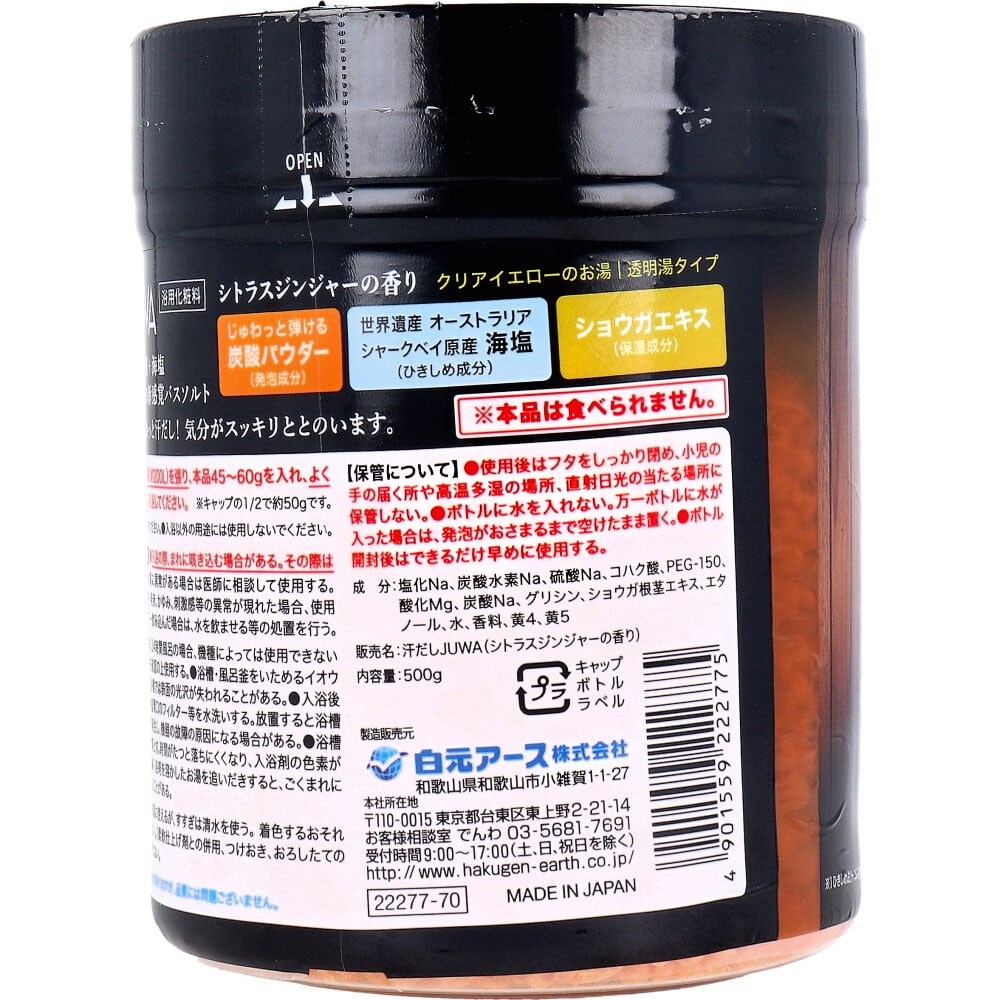 白元アース 汗だし JUWA 炭酸バスソルト シトラスジンジャーの香り 500g 1個(ご注文単位1個)【直送品】