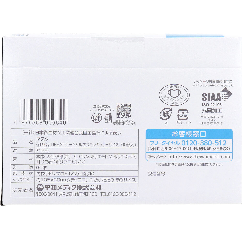 平和メディク ライフ 3Dサージカルマスク レギュラーサイズ 60枚入 1箱(ご注文単位1箱)【直送品】