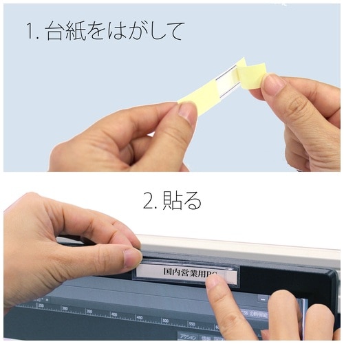 - 裏面に粘着剤付き。ファイル・棚・書庫などに。横から出し入れ。粘着剤が残らないので、別の場所に貼り替えて使用できます。●外形寸法(縦)[mm]:15●外形寸法(横)[mm]:75●中紙:有●材質:ポリ塩化ビニル(無移行性加工)●ソフト●中紙寸法:縦10×横70mm●入数:100枚●本体重量[g]:120