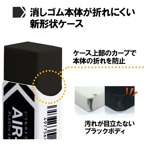- ロングセラー消しゴム【エアイン】シリーズがフタル酸エステル不使用の安心仕様に!多孔質セラミックパウダーの働きで、いつもカドで消す感触!●外形寸法(長)[mm]:65●外形寸法(幅)[mm]:25●外形寸法(厚)[mm]:14●寸法:W25×D66×H14mm●入数:1●色:黒●タイプ:ブラック●材質:本体=PVC、ケース=紙●本体重量[g]:28