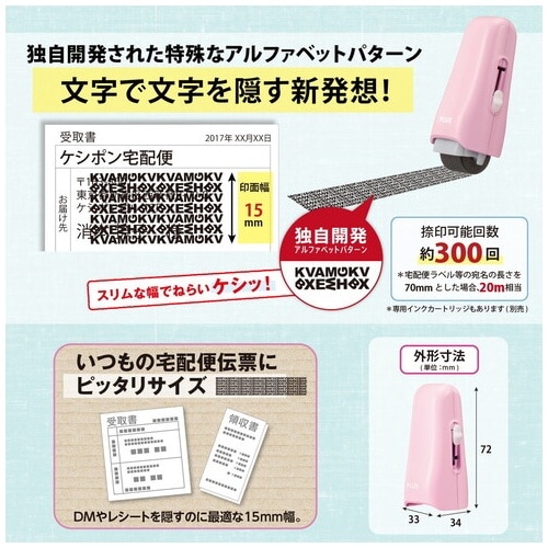 住所、氏名、口座番号、明細書、カード番号等の個人情報を隠す!しっかり握れるスティックタイプ。使いたい時に片手でサッと出し入れができるスライダー機構搭載●本体色:サクラピンク●インク色:黒●印面幅[mm]:15●外形寸法(幅)[mm]:34●外形寸法(奥)[mm]:33●外形寸法(高)[mm]:72●捺印距離:約20m分(300回捺印相当※1回=70mmとした場合)●材質:ABS、POM●インク種類:油性顔料系インキ●本体重量[g]:24