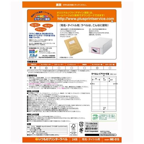 プラス PLUS ラベル いつものラベル 森林認証紙 24面 20枚 ME-515 48-617 1袋(ご注文単位1袋)【直送品】
