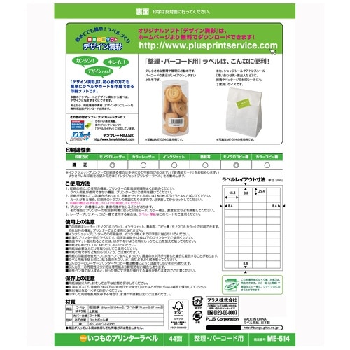 プラス PLUS ラベル いつものラベル 森林認証紙 44面 20枚 ME-514 48-619 1袋(ご注文単位1袋)【直送品】