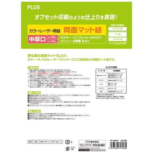 プラス PLUS カラーレーザー用紙 両面マット紙 A4 中厚口 100シート入 PP-120WX-T 56-205 ホワイト 1冊(ご注文単位1冊)【直送品】
